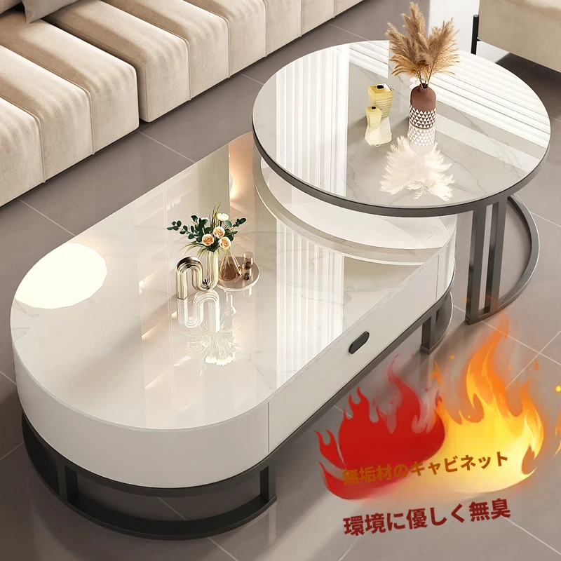 三夢の天然木製ロックストーンコーヒーテーブル|2024新作|リビングに最適な軽やかでラグジュアリーなデザイン|コンパクトなお部屋にもぴったりなテレビボード付きテーブル